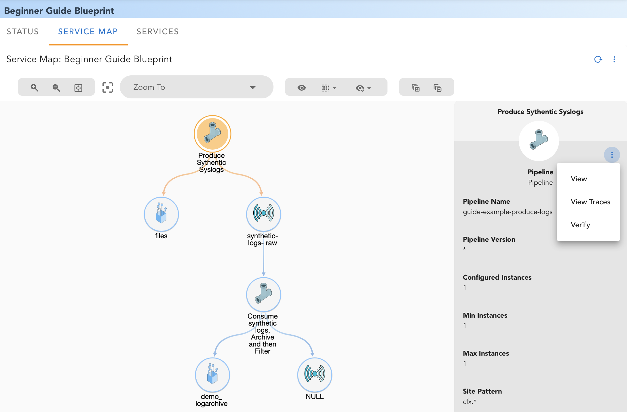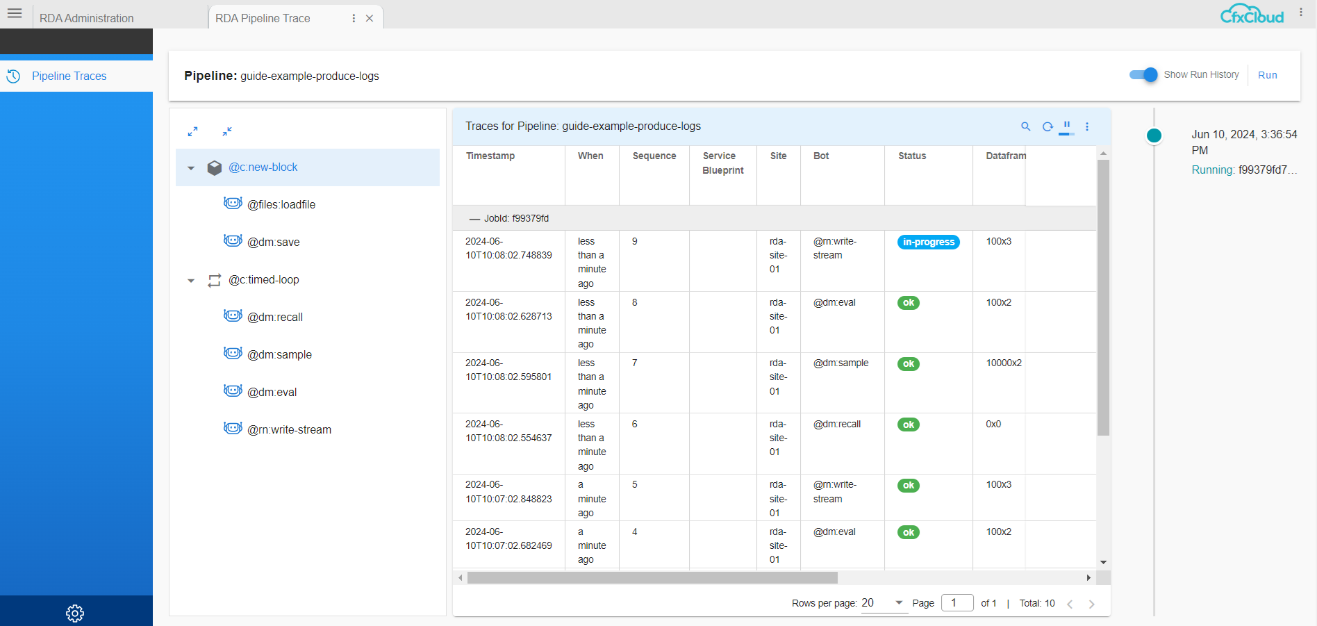 For the sake of future reference, let us save the pipeline with name guide-example-produce-logs in RDA Studio