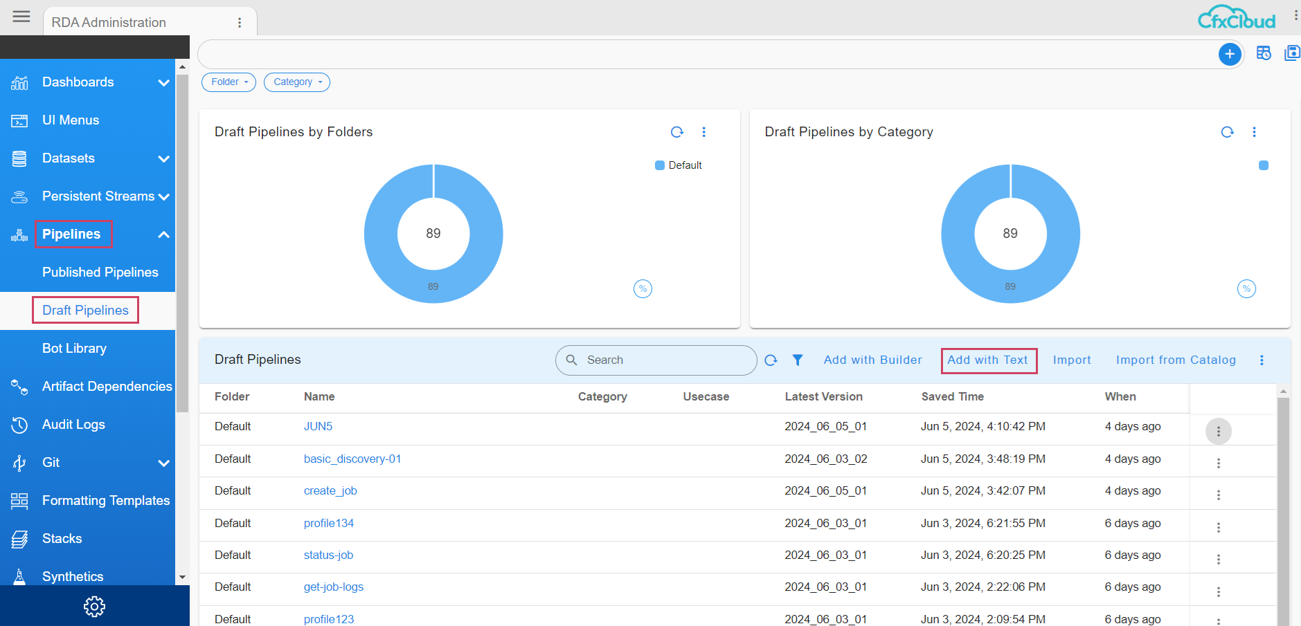 Select Draft Pipelines and Click on Add with Text action to add the pipeline.