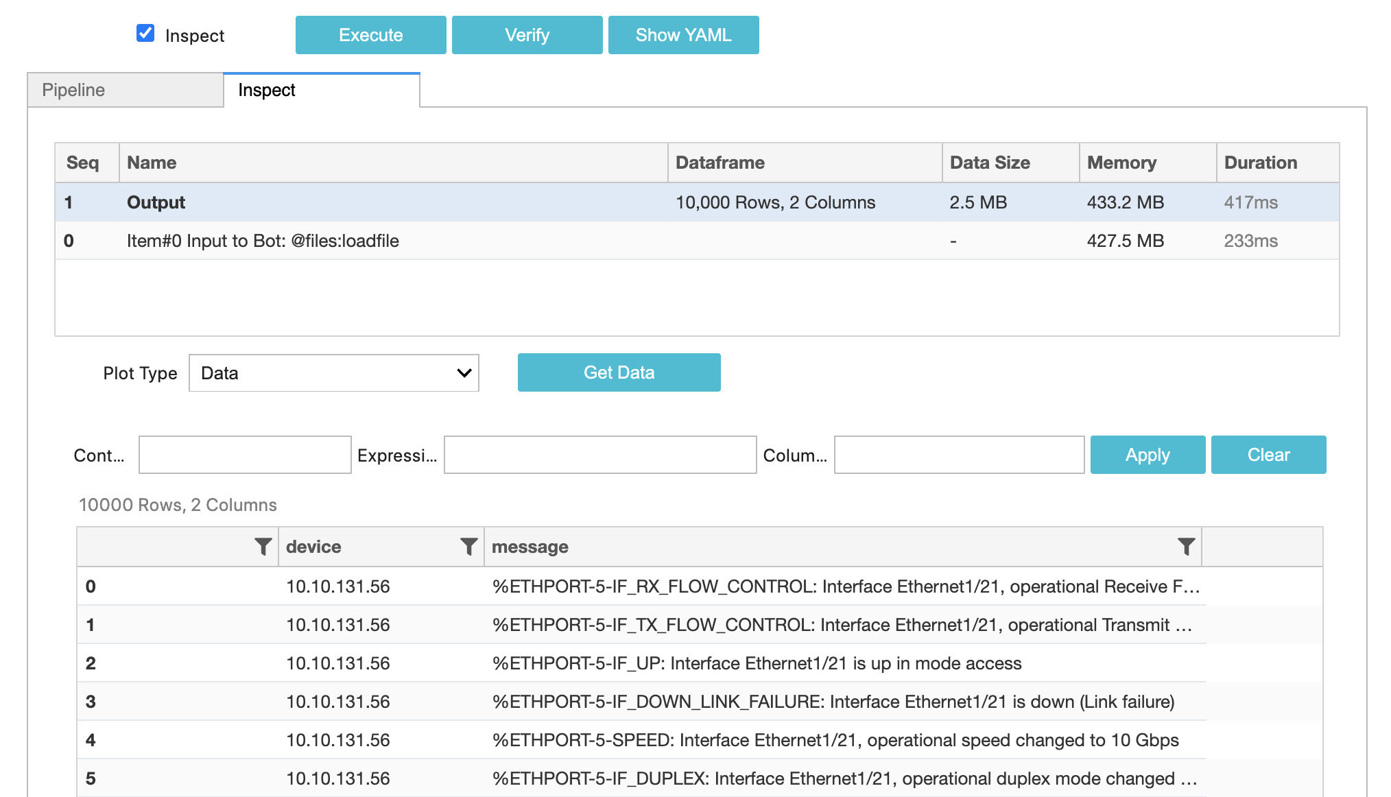 You will also see that output dataframe has just two columns: Device and Message. Let us add timestamp column using @dm:eval Sink Bot. This bot adds a new column using expressions for each row.