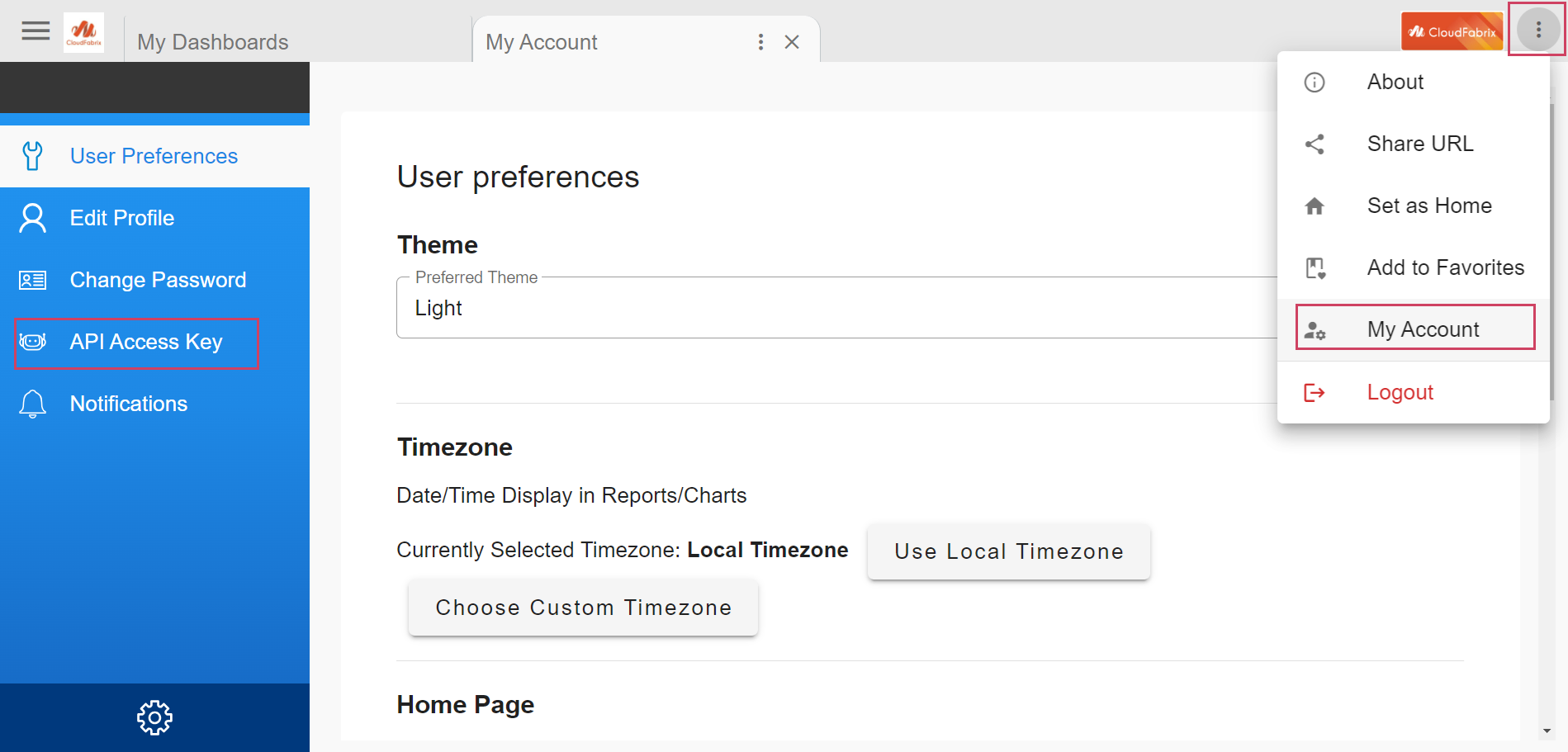 After login into the RDAF UI Portal, click on action icon at the top right corner as shown in the below screen shot go to My Account and then on the left side user can find the Api Access Key Option.