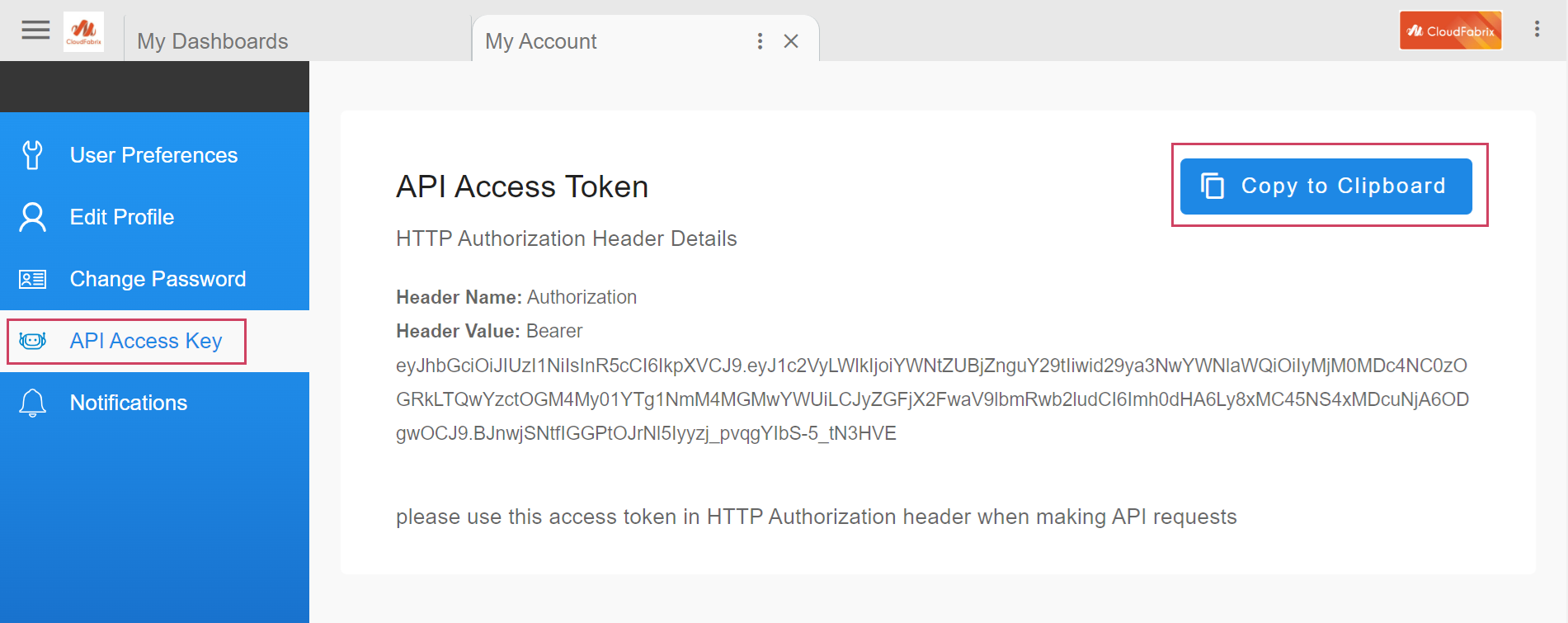 Click on the API Access Key menu and click on Copy to Clipboard to copy the API Access Token
