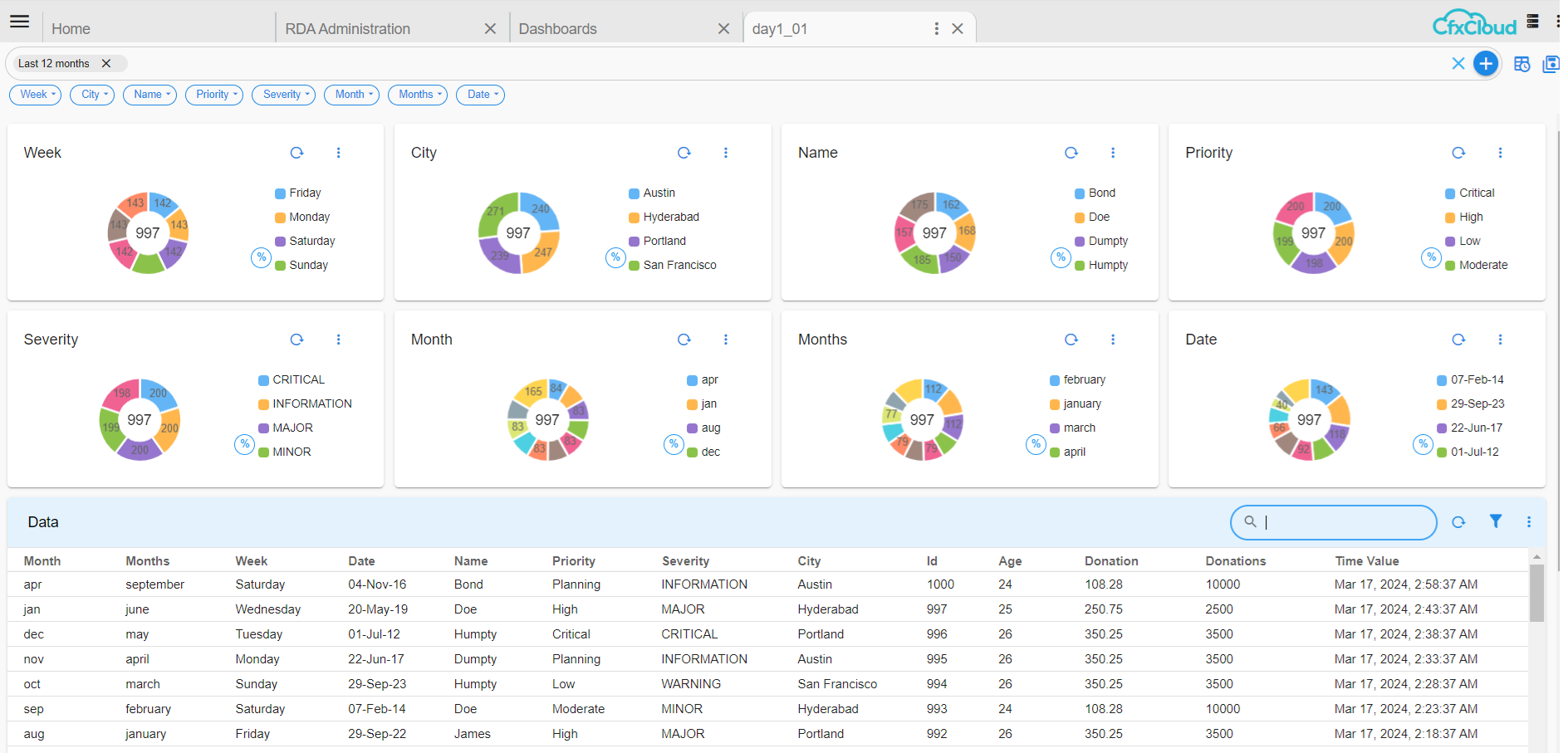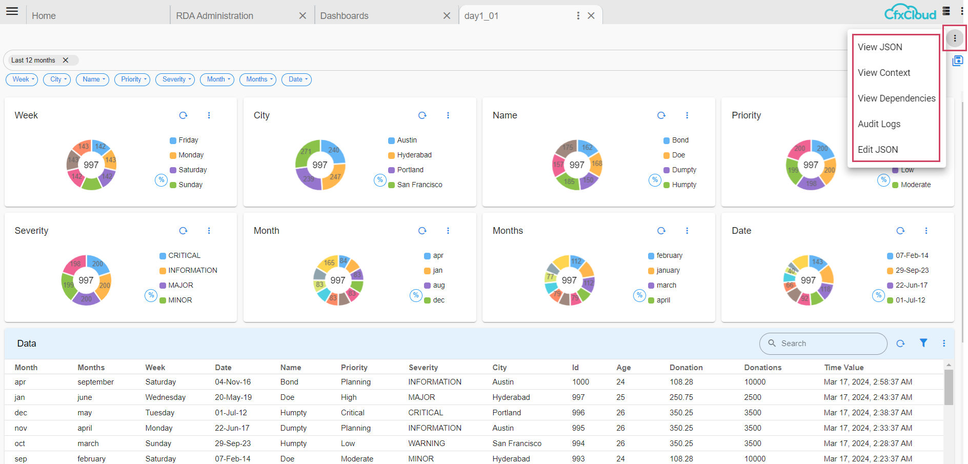 Dashboards feature in RDA Fabric platform provides analytics and reporting using which different UI views can be created for different user personas such as executives, IT admins and operators etc. Dashboards are composable and customizable to fit specific user needs within the IT operations landscape.