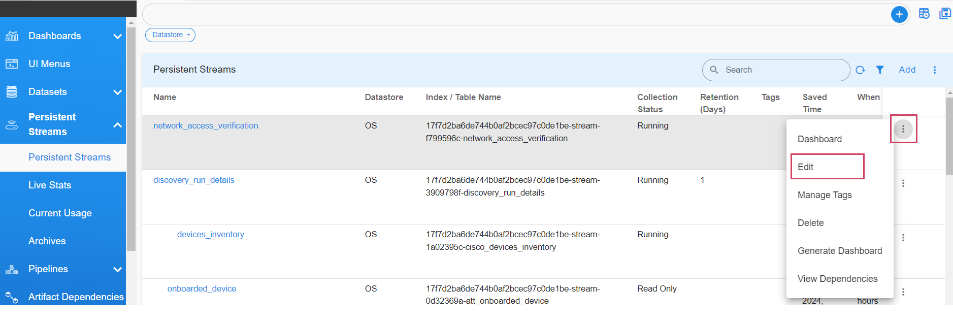 Login into RDAF UI portal and go to Main Menu --> Configuration --> RDA Administration --> Persistent Streams --> Select the Edit Action as shown in the screenshot below