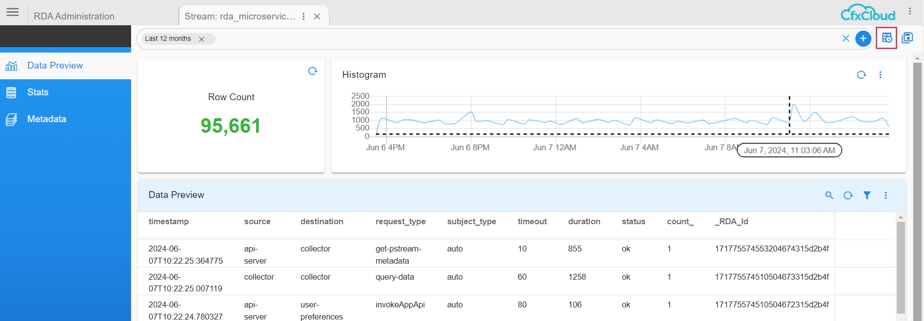 Data Preview: In this view, it presents all the ingested data into the persistent stream. It provides a filter bar along with a quick time filter highlighted in the top right side using which data can be filtered to validate the ingested data.