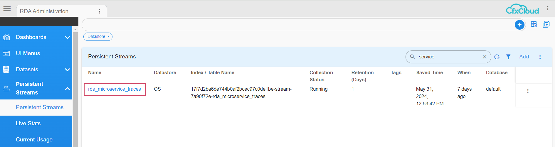 Login into RDAF UI portal and go to Main Menu --> Configuration --> RDA Administration --> Persistent Streams --> Click on the Persistent Stream Here in the below screenshot rda_microservice_traces Persistent Stream is selected to view the data.