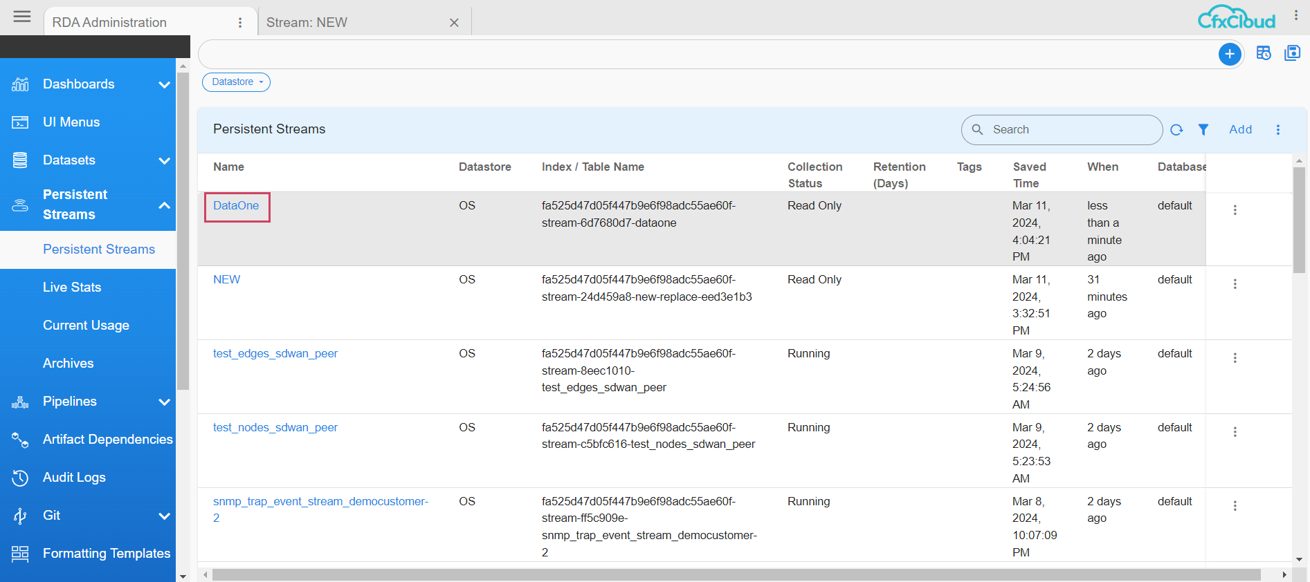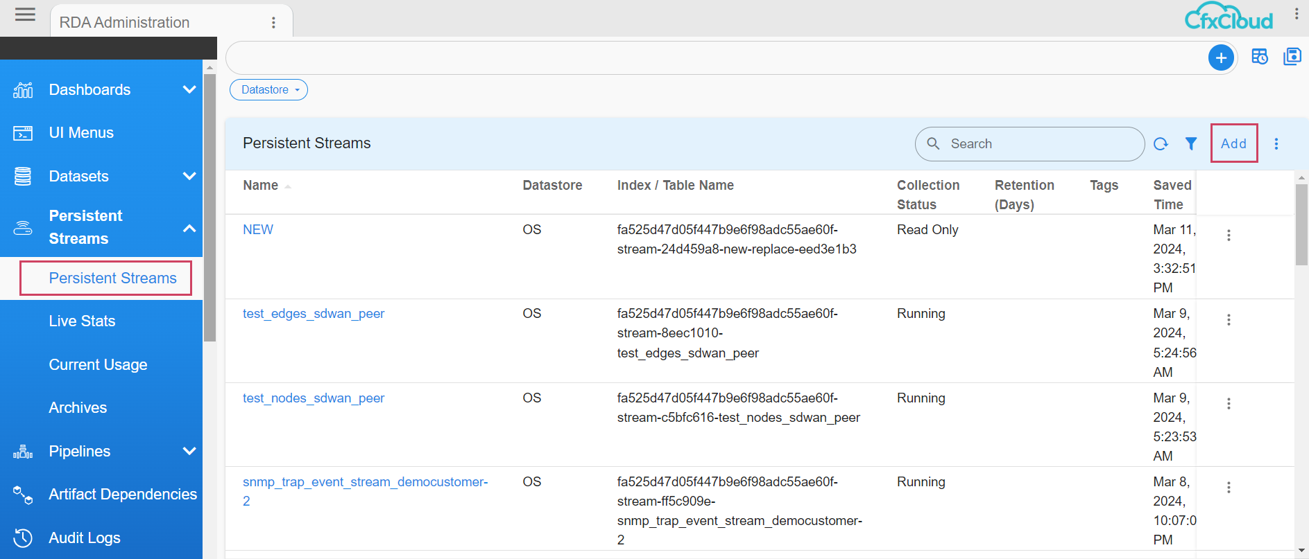 Login into RDAF UI portal and go to Main Menu --> Configuration --> RDA Administration --> Persistent Streams