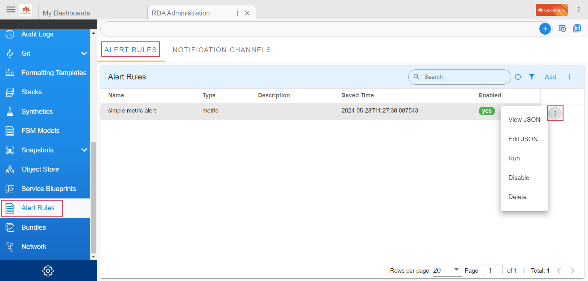 The Test Run action can be used to execute the alert rule to validate end-to-end. If the alert rule results in an OPEN or CLEAR state, the corresponding notification channels (webhooks) will receive the alert message.