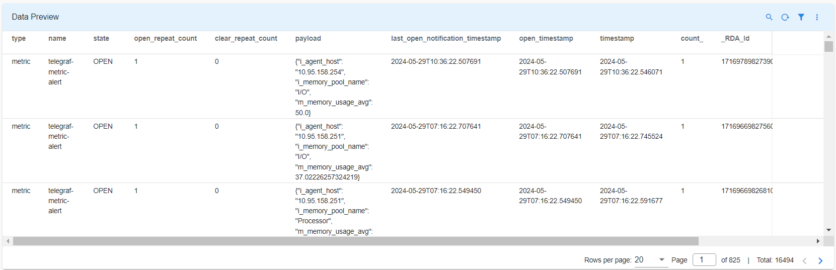 Alert State Management data is persisted in the rda_alert_state_management_data pstream. To support the alert lifecycle, a new record is created for each device and metric combination when an alert transitions to the OPEN state, provided it was previously in the CLEAR state or if no record exists for the same device and metric combination.
