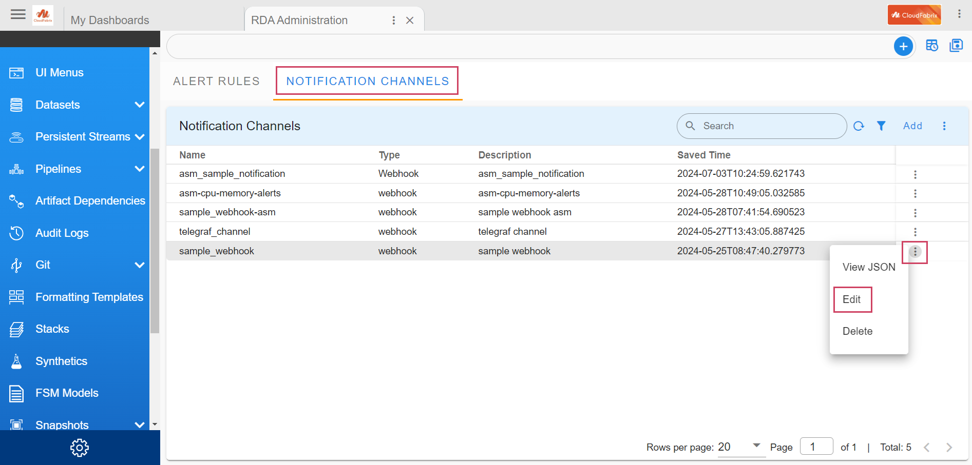 To create or modify a Notification Channel, login into RDAF Platform as MSP Admin user and go to Main Menu --> Configuration --> RDA Administration --> Alert Rules --> Notification Channels